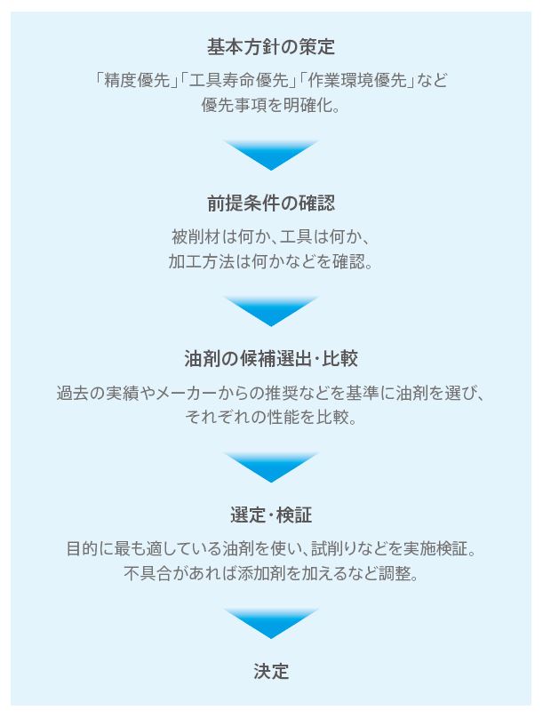 油性切削油と水溶性切削油を使い分けるにあたっての判断基準にはさまざまなものがあります。具体的には切削加工における「基本方針」として精度・工具寿命・作業環境の何を優先するのかを明確化することに加え、対象となる部材・工具・加工方法は何かなどの「前提条件」の確認が必要になります。さらに過去の実績やメーカーによる死傷などを基準に油剤を選び、それぞれの性能も比較する必要があります。このように複数の判断基準・観点を用いて選定してください。